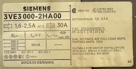Siemens 3VE3000-2HA00 Motor Starter 600VAC 30A 30HP