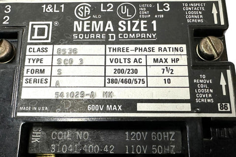 Square D 8536 SC0 3 Starter Form S Series A 200-575VAC 7.5-10HP Max NEMA Size 1