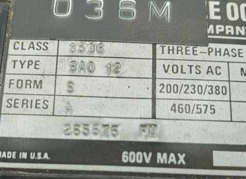 Square D 8536SAO12 Ser. A Nema Size 00 3 Pole Motor Starter 9A 1.5HP @ 230V