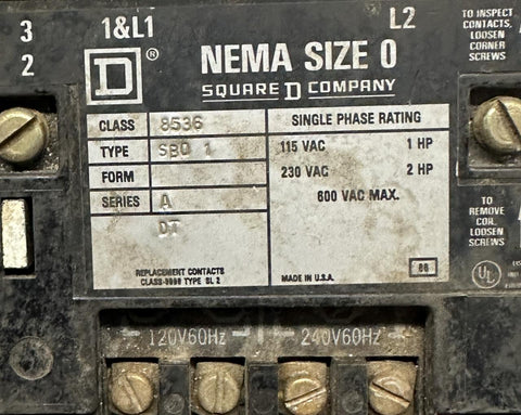 Square D 8536SBO1 Motor Starter Series A 120 VAC Coil NEMA Size 0
