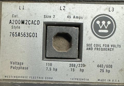 Westinghouse A200M2CACD Non-Reversing Motor Starter NEMA Size 2 45A 3-Phase