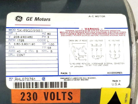 General Electric 5K49QG9981 Motor 1 HP 3 PH 1725 RPM 208-230/460V