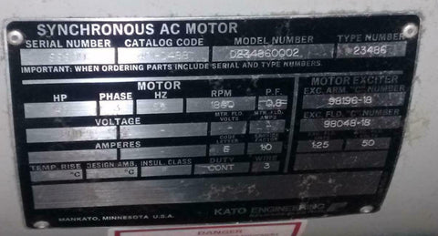 You are Purchasing a Kato Reliance Electric Synchronous AC Motor. Model: 4P1-0488 D234860002 This Motor is in Great Condition and Fully Guaranteed. 208 VAC We would gladly load it on your truck at no charge or help you plan the most economical delivery.