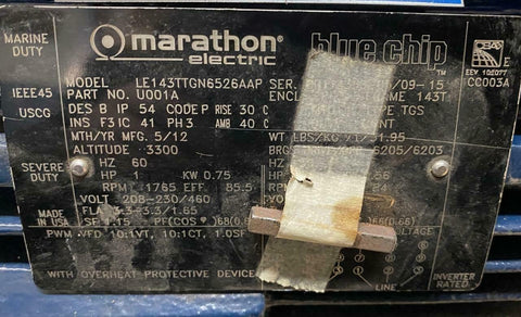You are Purchasing a Marathon Electric 3-Phase AC Motor. Model: 143TTGN6526AAP U001A This Motor is in Great Condition and Fully Guaranteed. We would gladley load it on your truck at no charge or help you plan the most economical delivery.