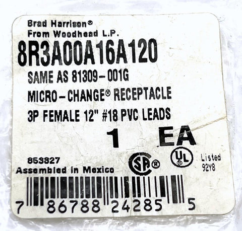 Brad Harrison 8R3A00A16A120 Micro-Change Receptacle 3-Pole Female 12" #18 Leads