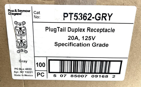 Pass & Seymour Legrand PT5362-GRY PlugTail Duplex Receptacle 20A 125VAC -100 Box