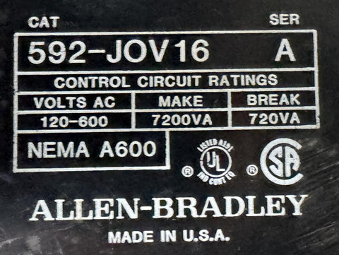 Allen-Bradley 592-JOV16 Overload Relay 120-600 VAC Nema A600 Series A