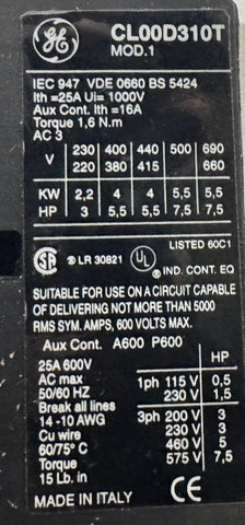 General Electric CL00D310T Contactor W/ RT1N Overload Relay