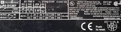 Telemecanique LR3 D1307 Overload Relay Ui 750V Uimp 6kV 600V 3Ph Class 10A