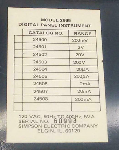 Simpson 2865 Digital Panel Meter 120 VAC 50-400 Hz 5 VA Made in USA