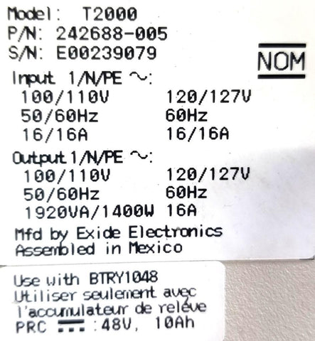 Compaq T2000 Uninterruptable Power Supply 242688-005 50-60Hz 16A