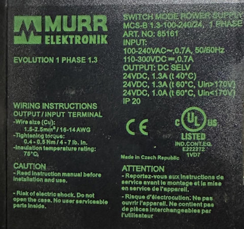 Murr Elektronik MCS-B 1.3-100-240/24 Switch Mode Power Supply 24VDC 1.3A 85161