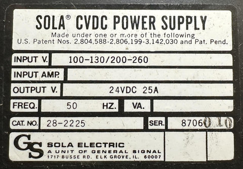 Sola 28-2225 CVDC Power Supply 24VDC 25A Output 50 HZ 100-130V / 200-260V Input