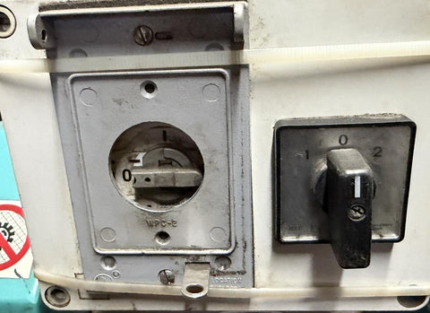 NOTE: The saw has damage to the front control panel. It will need to be refastened to the saw frame. The On/Off switch will need to be replaced as pictured.