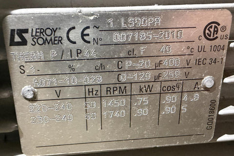 Motor: Leroy Somer .90 / .75 kW 220-240V