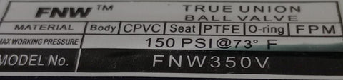 FNW FNW350V CPVC True Union Ball Valve 1/2" NPT PTFE Seat 150PSI @ 73­­°F