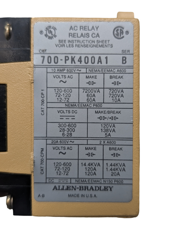 Allen-Bradley 700-PK400A1 Industrial AC Relay Series B 600 VAC 10 AMP 50-60 HZ