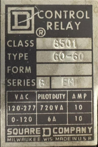 Square D 8501-G0-60 Control Relay Series B EM 120-277 VAC 10 AMP