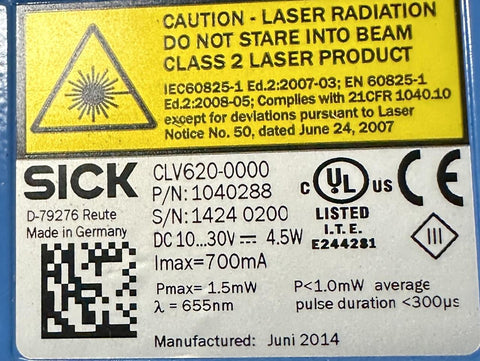Sick CLV620-0000 Barcode Scanner Fixed Mount 10-30 VDC Mid Range 1040288