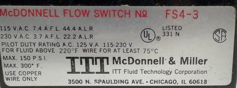 McDonnell & Miller FS4-3 Flow Switch 115/230 VAC 150 PSI