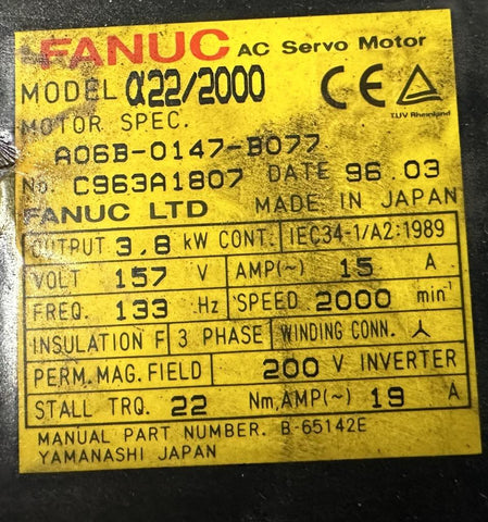 Fanuc A22/2000 AC Servo Motor Straight Shaft 3.8 W 15 A 2000 RPM A06B-0147-B077