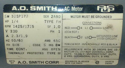 A.O. Smith 2A90 FH Single Phase AC Motor 230 VAC 1/4 HP 1425/1725 RPM