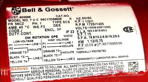 Bell & Gossett 169236 Single Phase Motor 1-1/2HP 1725RPM 115/208-230V 60HZ