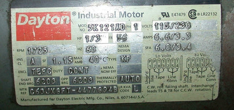 You are Purchasing a Dayton Single Phase AC Motor. Model : 5K121AD This Motor is in Fair Condition and Fully Guaranteed. Single Phase 115/230 VAC Shipping and handling is $19.90 within the Continental USA.