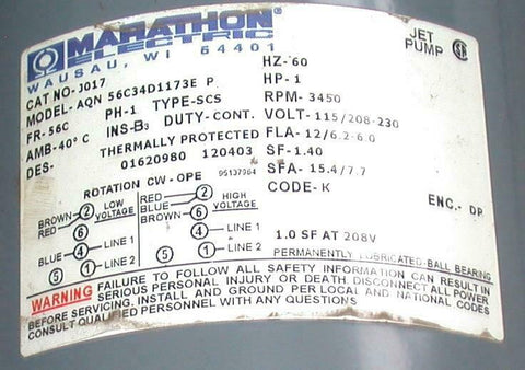 You are Purchasing a Marathon Electric Single Phase AC Motor. Model: J017 AQN 56C34D1173E P This Motor is in Great Condition and Fully Guaranteed. Shipping and Handking will be $19.90 in the Continental USA