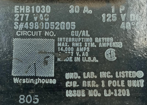 Westinghouse EHB1030 1-Pole Circuit Breaker 30A 277VAC 125VDC