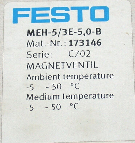 This is an Auction for a New in the Box, Festo MEH-5/3E-5,0-B Way Solenoid Valve, Part# 173146. Each bid is for One unit.