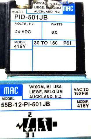 MAC 55B-12-PI-501JB Solenoid Valve VAC to 150psi W/ PID-501JB Coil 24VDC 6W