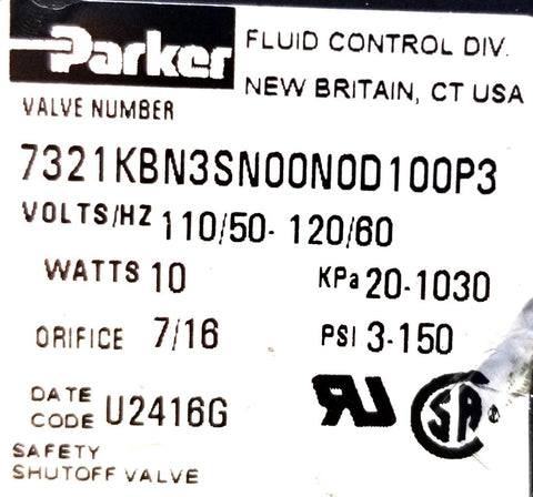 Parker 7321KBN3SN00N0D100P3 Solenoid Valve 110-120V 50-60Hz 3-120Psi