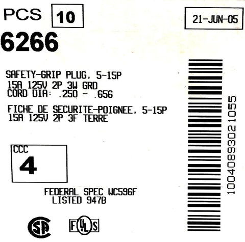 Cooper 6266 Safety Grip Straight Plug 15A 125V 3W Nema 5-15P (Box of 10)