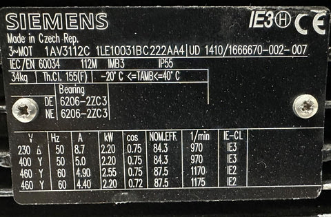 Siemens 1LE10031BC222AA4 Electric Motor 2.2kW 1175 RPM 230/460V 3 Phase 1AV3112C
