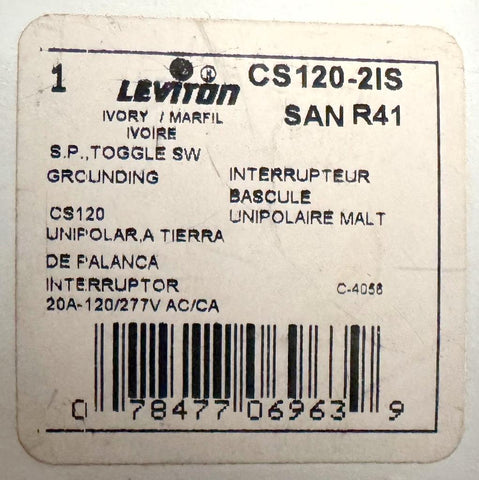 Leviton CS120-2IS Single Pole Toggle Switch 20A 120/277V AC/CA