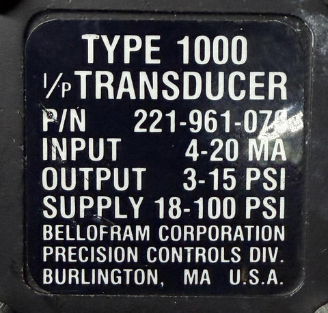 Bellofram 221-961-070 Type 1000 I/P Transducer 4-20mA 3-15 PSI