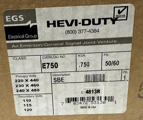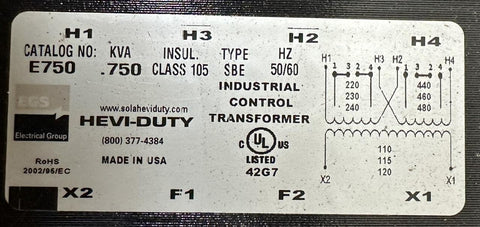 EGS Hevi-Duty E750 Industrial Control Transformer 0.750 kVA 240/480V Primary