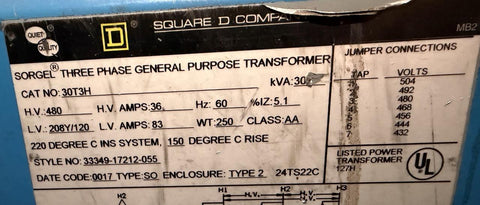 Square D 30T3H Transformer 30 KVA 480V HV 208/120V LV Class AA 3 Phase