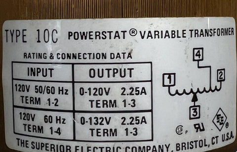 Superior Electric 10C Powerstat Variable Transformer 120V 0-132V 50/60Hz 2.25A