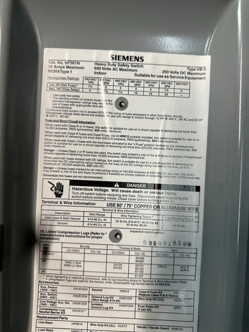 Siemens HF361N Heavy Duty Fusible Safety Switch 30A 600 VAC 3 Pole 3 Ph 4 Wire