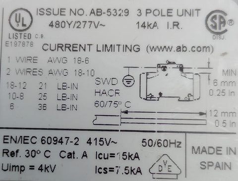 Allen-Bradley 1489-A3D150 Ser. A Miniature Circuit Breaker 3 Pole 15A 480Y/277V