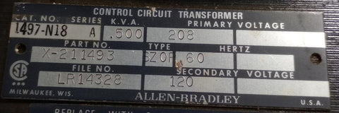 Allen-Bradley 1497-N18 Ser. A Control Circuit Transformer .500KVA 208/120V 60HZ