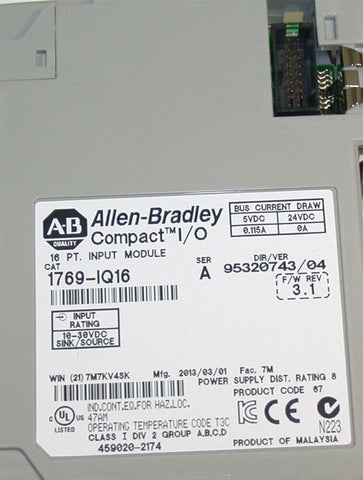 1- 1769-IQ16 Input Module, CompactLogix, DC Digital, 16 Point, 10-30VDC, 16 Sinking or Sourcing Point Input