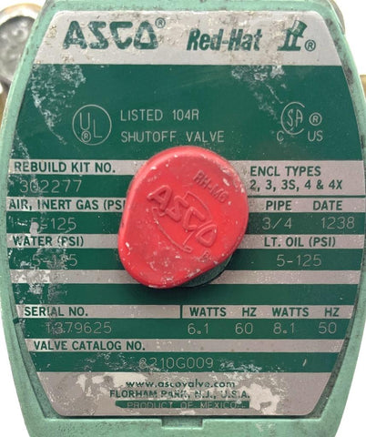 ASCO 8210G009 Red-Hat 2-Way Solenoid Shut-Off Valve 5-125PSI 3/4" NPT 24VDC