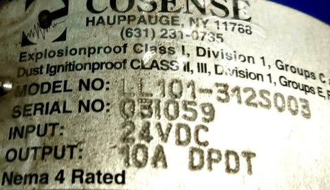 This is a fixed listing for a Cosense LL101-312S003 Explosion Proof Level Switch 24VDC 10A Model: LL101-312S003 Specifications: Brand: Cosense Type: Level Switch 24VDC 10A The item is exactly as pictured.