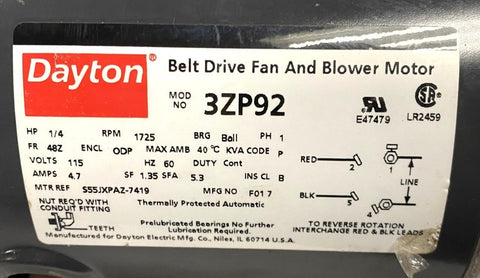 Dayton 3ZP92 Blower Motor 1/4 HP 1725 RPM 115V 1 Phase