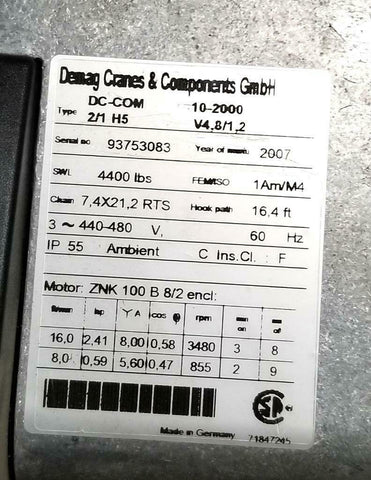 Demag DC-Com 2/1-H5 Electric Chain Hoist 4400 Lbs 440-480 V 16' 4" Hook Path