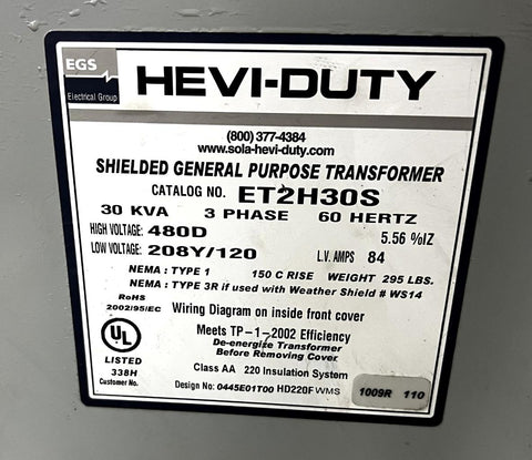 EGS Hevi-Duty ET2H30S 30 KVA Transformer Dry Type 480V D to 208/120V 3 Phase