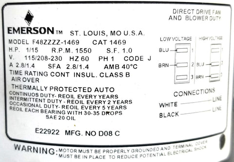 Emerson F48ZZZZ-1469 Direct Drive Fan And Blower Duty 1/15HP 1550RPM 115-230V